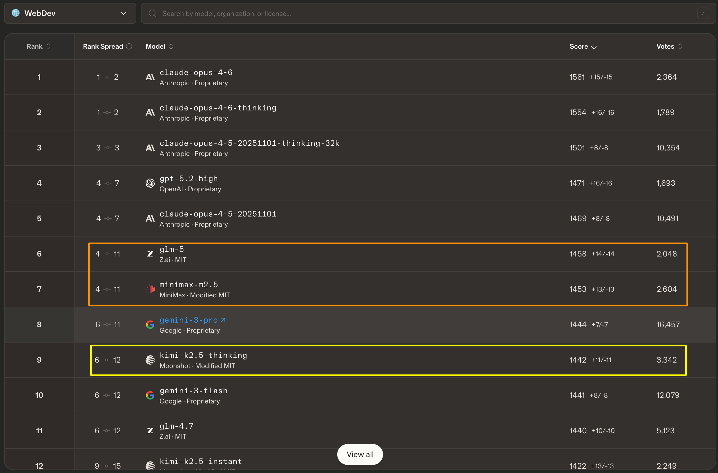 之前一个月使用了 MinMax-M2.1,GLM-4.7 和 Kimi-2.5 ,最终给我体验最好的是发布最晚的 Kimi-2.5。到了 2 月份, MinMax-M2.5,GLM-5 轮番上阵,排名很快就变化了。虽然总分数没啥差别,但对于我们个人或是中小型公司来说,卷起来是好事。